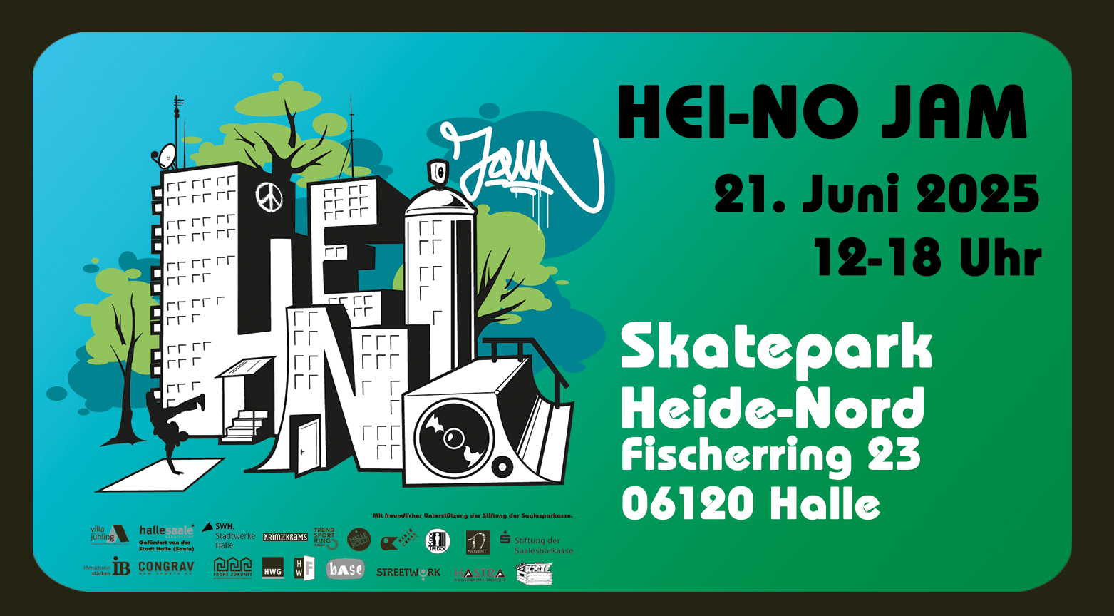 Am Samstag, den 21. Juni 2025 steigt von 12.00-18.00 Uhr im halleschen Stadtgebiet Heide Nord die traditionelle „Hei-No Jam“. Es wird wieder ein ganzer Tag lang Jugendkultur pur zelebriert!