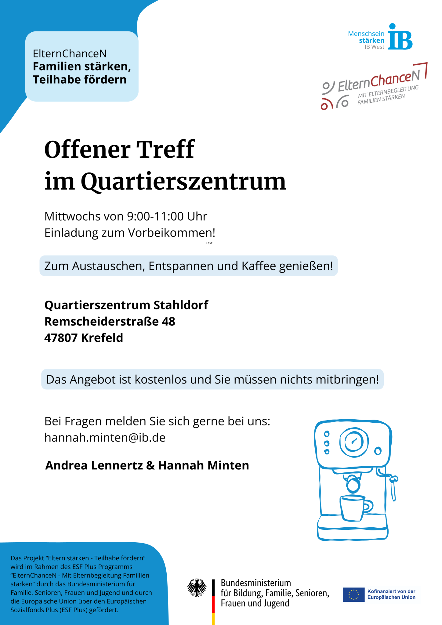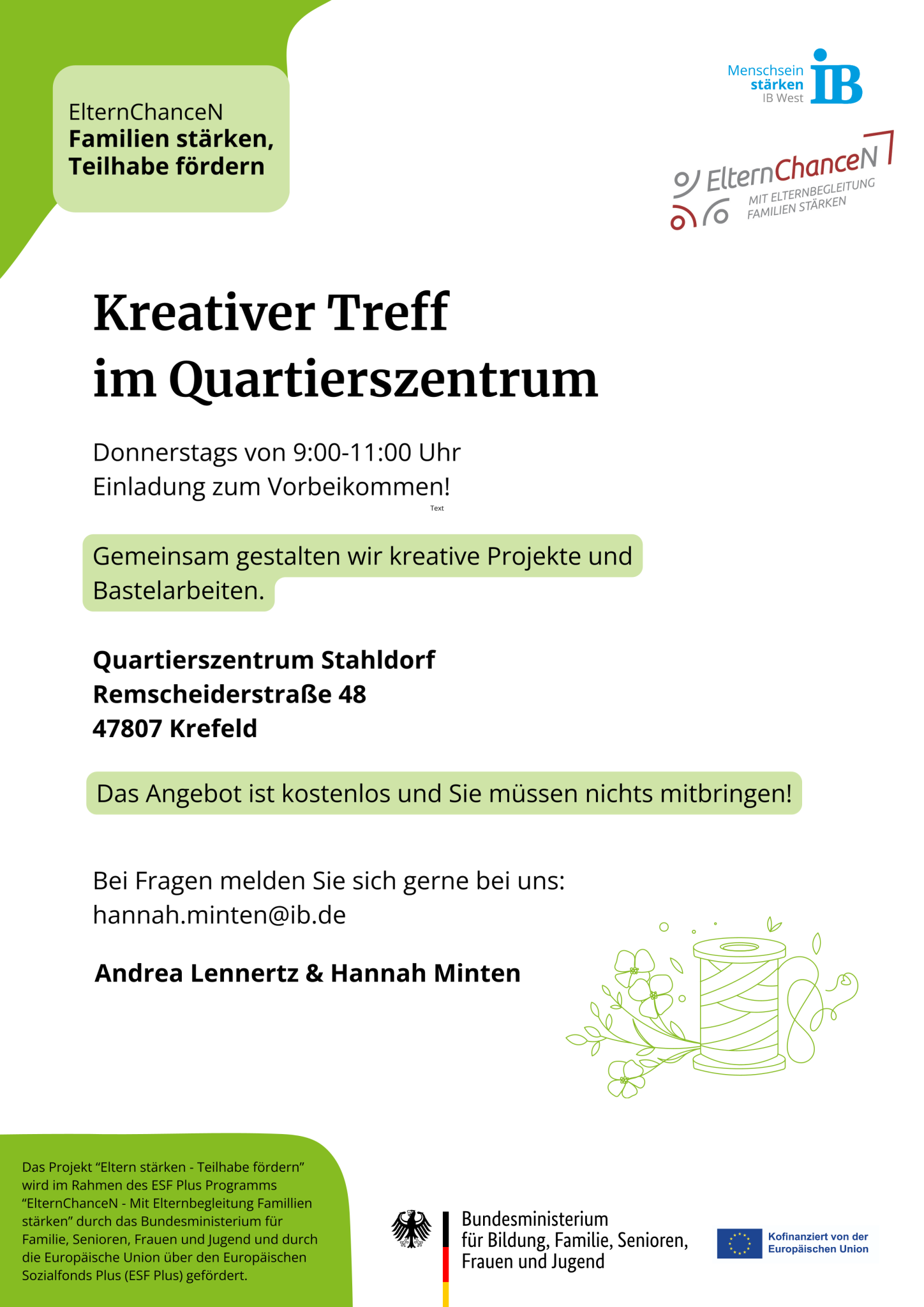 Das Projekt "Eltern stärken - Teilhabe fördern" wird im Rahmen des ESF Plus-Programms "ElternChanceN - Mit Elternbegleitung Familien stärken" durch das Bundesministerium für Familie, Senioren, Frauen und Jugend und durch die Europäische Union über den Europäischen Sozialfonds Plus (ESF Plus) gefördert.