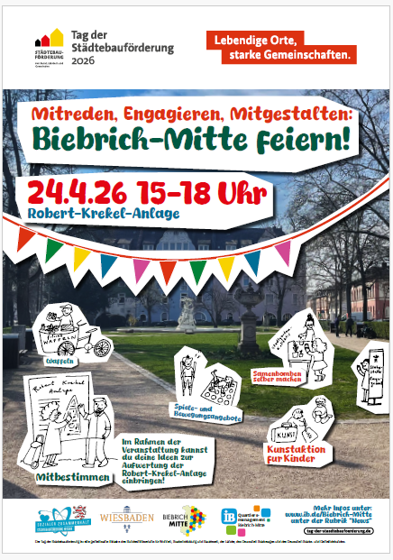 Am 24. April 2026 wird in Biebrich der bundesweite Tag der Städtebauförderung gefeiert. Von 15 bis 18 Uhr sind alle Interessierten herzlich eingeladen, auf die Robert-Krekel-Anlage zu kommen und sich über aktuelle Entwicklungen in Biebrich-Mitte zu informieren, mit Akteurinnen und Akteuren aus dem Stadtteil ins Gespräch zu kommen und gemeinsam einen Blick in die Zukunft des Quartiers zu werfen.